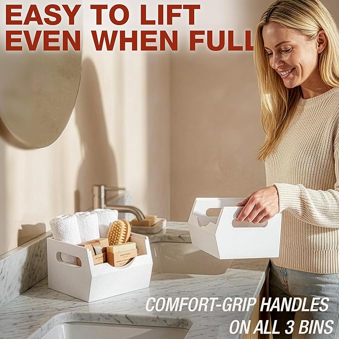 HOMESTEAD Stackable Solid Wood Storage Bins for Kitchen Pantry & Countertop, Ventilated Potato and Onion Basket Organizer with Handles, Wooden Produce Storage Containers, 3-Pack, White