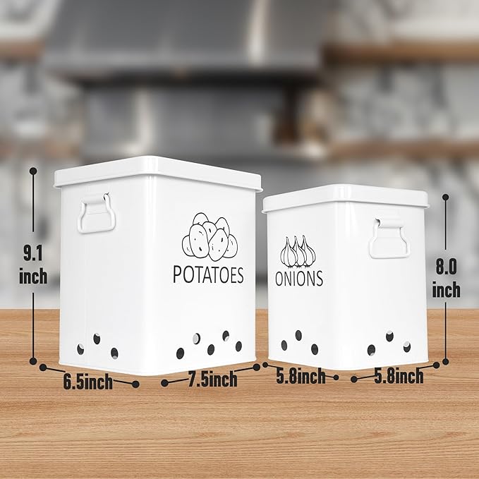 - Keep Your Countertop Clutter-free: Maximize shelf space and keep your kitchen tidy with this large potato and onion storage container featuring handle lids. The internal diameters are 9*7.5*6.7'' for the potato bin, 7.8*6*6'' for the onion bin.