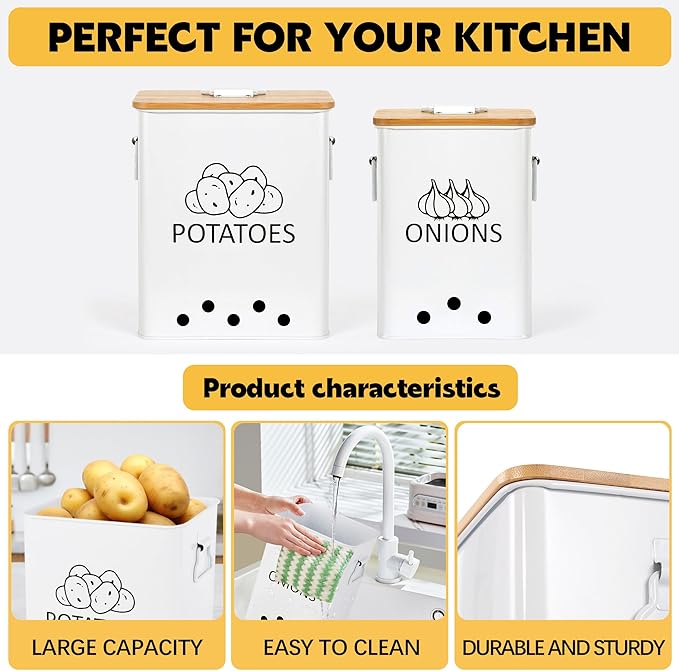- Keep Your Countertop Clutter-free: Maximize shelf space and keep your kitchen tidy with this large potato and onion storage container featuring handle lids. The internal diameters are 9*7.5*6.7'' for the potato bin, 7.8*6*6'' for the onion bin.