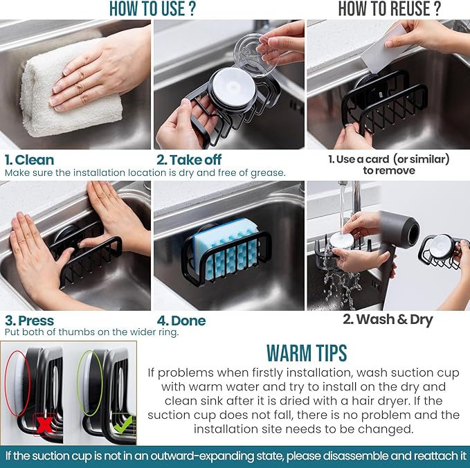 - [1 Second Installation & Removable]: Simply press down the suction cup to squeeze the air out, they will stick to the wall firmly. You can finish the installation in 1 second. No screws, no nails, no glue, no tools. The kitchen sink caddy can be re-positioned many times and removed without leaving residues (If problems when firstly installation, wash suction cup with warm water and try to install on the dry and clean sink after it is dried with a hair dryer. If the suction cup does not fall, there is no problem and the installation site needs to be changed.)