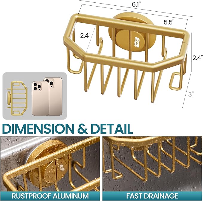 - [Rustproof & Fast Draining]: Made of aluminum finished in rustproof coating which not only prevents rust but also stands up to times. With all-around drainage design, the sponge caddy has maximum air ventilation and fully dripes water away. Keep your kitchen tools air dry quickly and clean