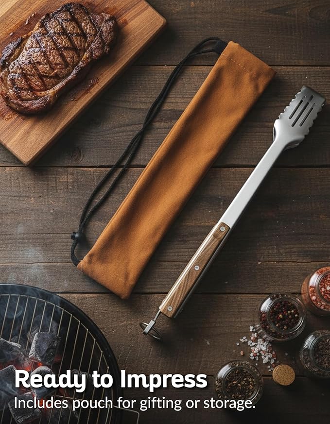 - Great Gift for Grill Masters: Includes a stylish suede-style pouch and sleek box, offering a premium gift experience for any BBQ lover. These bbq tongs for grill heavy duty are perfect for Father’s Day, birthdays, or housewarmings. Also ideal as food tongs for serving or camping tongs for cooks who grill anywhere they go.