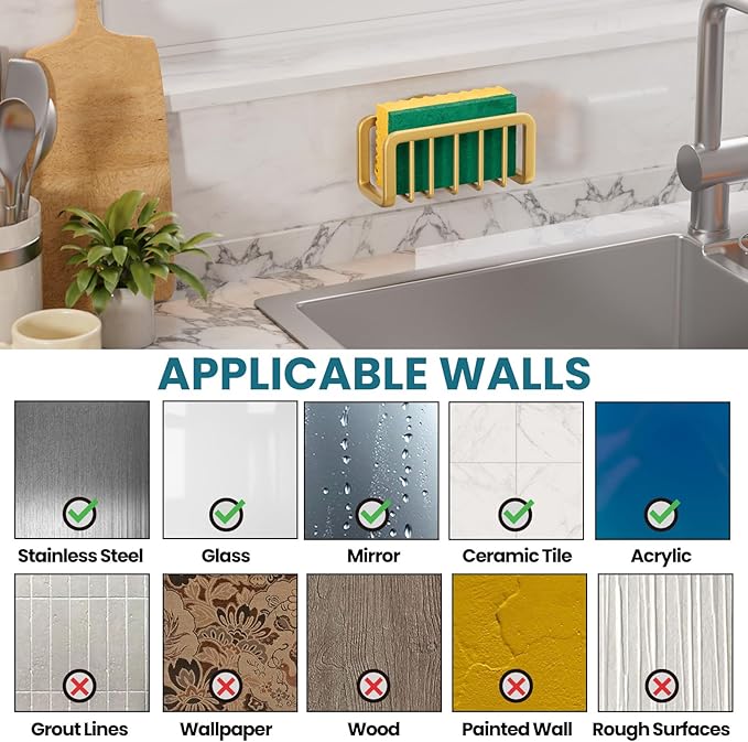 - [Warm Tips]: In order to ensure that the suction cups are effective, please ensure that the mounting surface is clean and dry before mounting. The dish sponge holder is ONLY stick on smooth, non-porous surfaces like metal, glass, tile, stainless steel and acrylic but NOT apply to uneven tiles, texture plate, unfinished marble, wallpaper, painted wall, etc