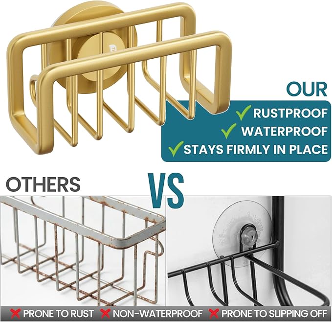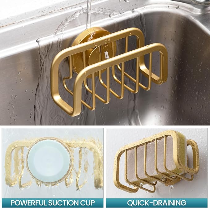 TAILI Sponge Holder for Kitchen Sink with Strong Suction Cup, Rustproof Aluminum Sink Caddy for Sponges, Removable Sponge Holder, Dish Brush for Scraper - Gold