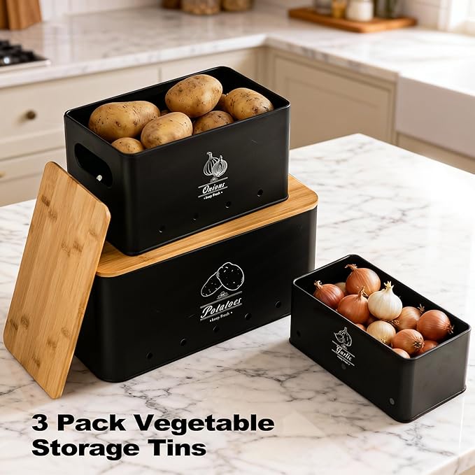 - Stackable Space-Saving Kitchen Organizer and Gift Idea – Designed with a flat top for easy stacking, these vegetable storage tins maximize space on kitchen countertops, in cabinets, or pantries. Practical and stylish, they make a thoughtful housewarming gift, holiday gift, or kitchen gift for home cooks and families.